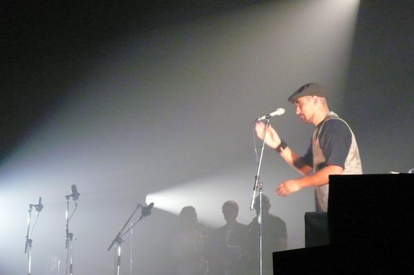 kredenzte lautstark dem hungrigen Publikum in bester Michael Buffer-Manier, worauf es ohnehin schon wochenlang gewartet hatte: „Here for you on stage direct from Lago Bay, Wellington, Alteroa: this sound is original, this sound is the one and only Fat Freddy’s Drop.“. Drei Bläser, ein Mann am Keyboard, ein Gitarrist, ein über allem thronender DJ Fitchie an den Controllern und Sänger Joe Dukie erhielten einen warmen Empfang von der bis auf den letzten Platz gefüllten Live Music Hall. Ein Drummer fehlte allerdings. Leider, denn dieser wurde im Verlauf des Abends schmerzlich vermisst. Klar, hinterher liest man überall, dass sie, wenn überhaupt, eigentlich fast nur im Studio mit einem Schlagzeuger arbeiten, und dass live DJ Fitchie mit seinem MPC diesen Part übernimmt. Dennoch hätte gerade ein Live-Drummer diese oft 15 bis 20 Minuten in die Länge gezogenen Stücke mit einer lockeren Spielweise und ein wenig Jamming und Improvisation in ihrer Schwere aufbrechen können. Jedoch füllte die blendende Horn-Section um Joe Lindsay, Toby Laing und Scott Towers diese Leerstelle hervorragend aus und bediente mit Posaune, Trompete, Tuba, Mundharmonika und diversen Saxophonen zudem eine große Bandbreite an Blasinstrumenten. Iain Gordon an Rhodes-Piano und mehreren Synthesizern sorgte für den nötigen Crisp von den Tasten, während Tehimana Kerr an der Gitarre mit seinem verranzt-virtuosem Spiel zum Einen dem Ganzen etwas Härte – stellenweise kam man sich sogar vor wie bei dem Konzert einer Postrock-Band – an anderer Stelle wiederum aber den Songs den letzten Schuss Funkyness verlieh. Einzig und allein Sänger Joe Dukie kam einem manchmal etwas hilflos vor. Ausgerechnet der Joe Dukie, mit dem das ganze Produkt steht und fällt, das die Band dem Zuschauer zu vermitteln versucht. Doch bei solch ausufernden und stark auf die Instrumente fokussierten Live-Versionen, wie sie bei Fat Freddy’s Drop an der Tagesordnung stehen, kann einem, der ausschließlich auf der Bühne steht, um zu singen und ein wenig die Gitarrensaiten zu streicheln, durchaus etwas langweilig werden. Und so tänzelte Joe Dukie ein wenig vor seinem kleinen Synthesizer, den er nur für einige wenige Stücke brauchte, wanderte von einem Ende der Bühne zum anderen, stieg zu DJ Fitchie auf sein Pult und schaute ihm wie ein Schüler über die Schulter oder verließ die Bühne mal ganz, um einige Minuten später pünktlich zu seinem Einsatz wieder zu erscheinen.
